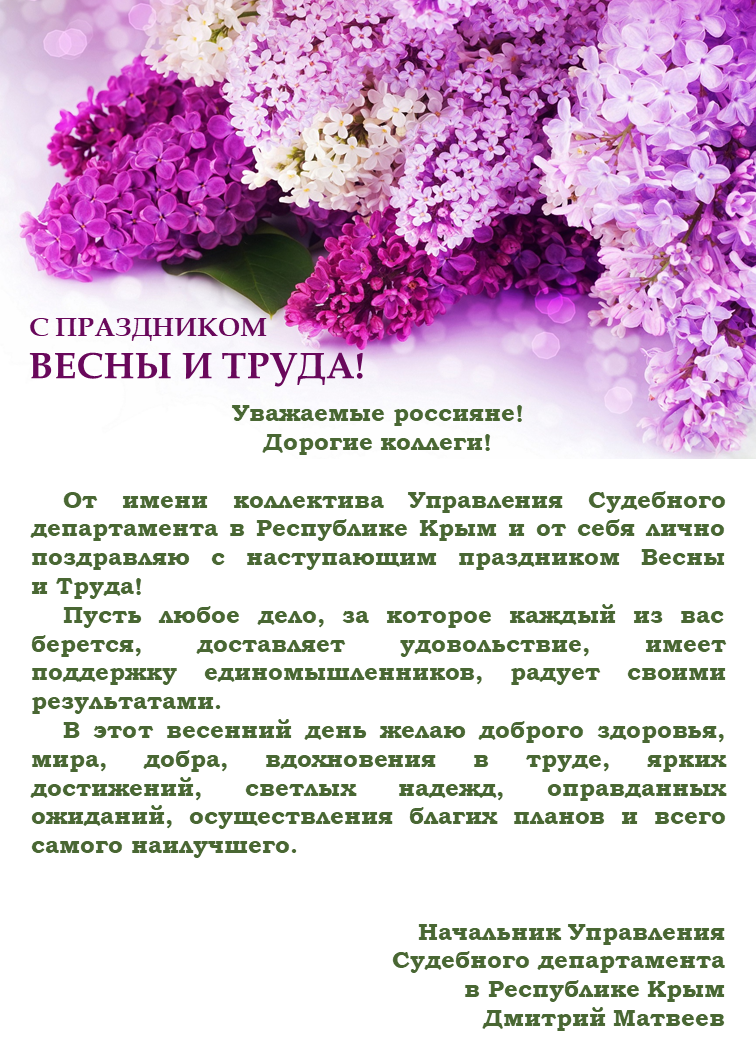 Поздравление начальника Управления Судебного департамента в Республике Крым Матвеева Д.В. с Праздником Весны и Труда