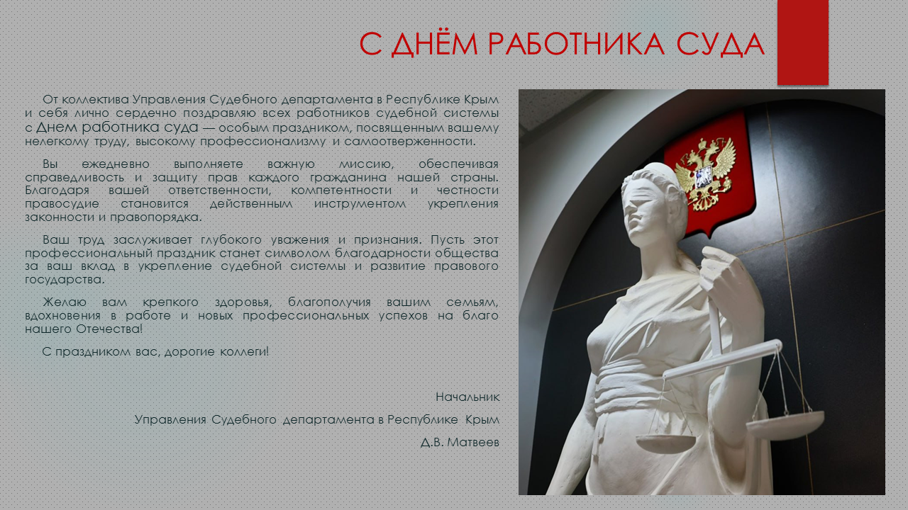 Поздравление начальника Управления Судебного департамента в Республике Крым Матвеева Д.В. с Днем работника суда