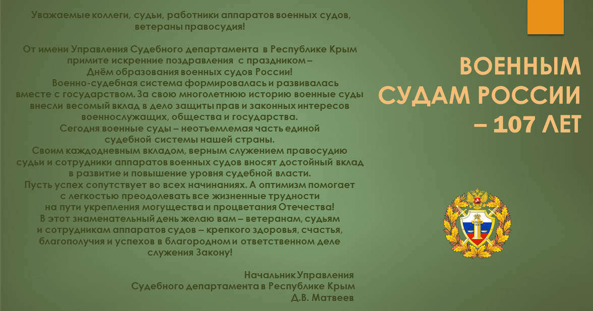 Поздравление начальника Управления Судебного департамента в Республике Крым Матвеева Д.В. со 107-й годовщиной образования военных судов России