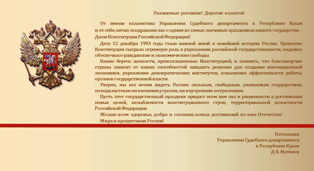 Поздравление начальника Управления Судебного департамента в Республике Крым Матвеева Д.В. с Днем Конституции РФ