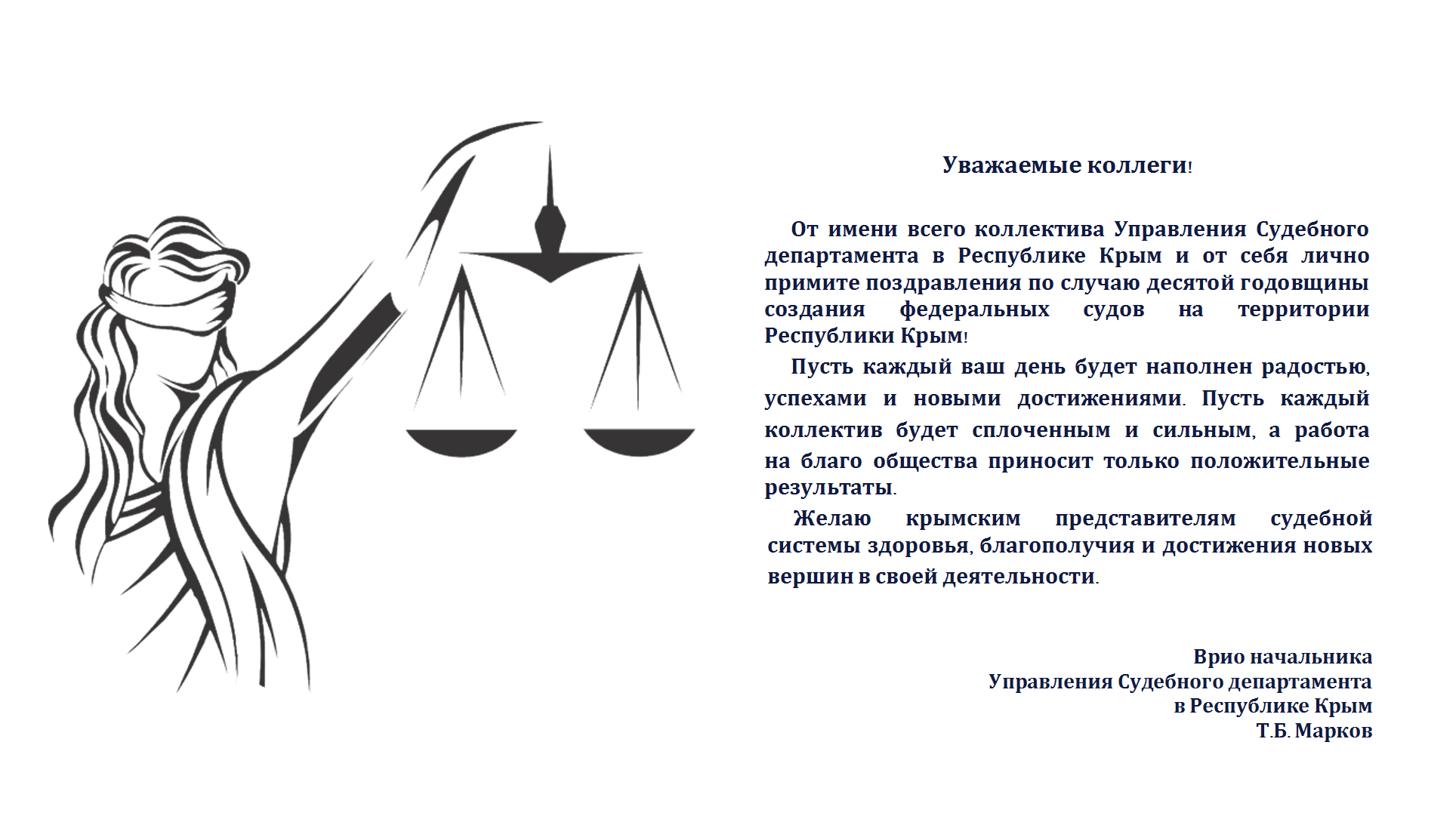 Поздравление врио начальника Управления Судебного департамента в Республике Крым Маркова Т.Б. с десятой годовщиной со дня создания федеральных судов на территории Республики Крым